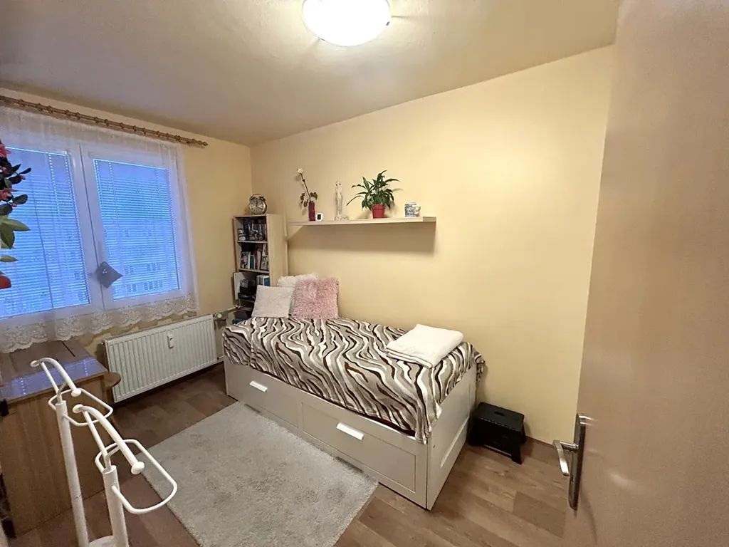 vstupní chodba, ložnice se vstupem na zasklenou lodžii, chodba s vestavěnou skříní, obývací pokoj, dětský pokoj, komora přímo v bytě, prostorná kuchyň s jídelnou, koupelna se sprchovým koutem a samostatné WC.