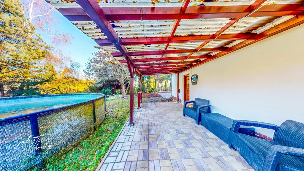 K domu náleží dvě prostorné terasy, které plynule rozšiřují obytný prostor směrem do zahrady. Jsou ideálním místem pro ranní kávu, klidný odpočinek i večerní posezení. Balkón orientovaný směrem k sousednímu pozemku slouží spíše jako praktický doplněk domu. Součástí pozemku je také bazén, který výrazně zvyšuje komfort bydlení a potěší zejména v letních měsících.