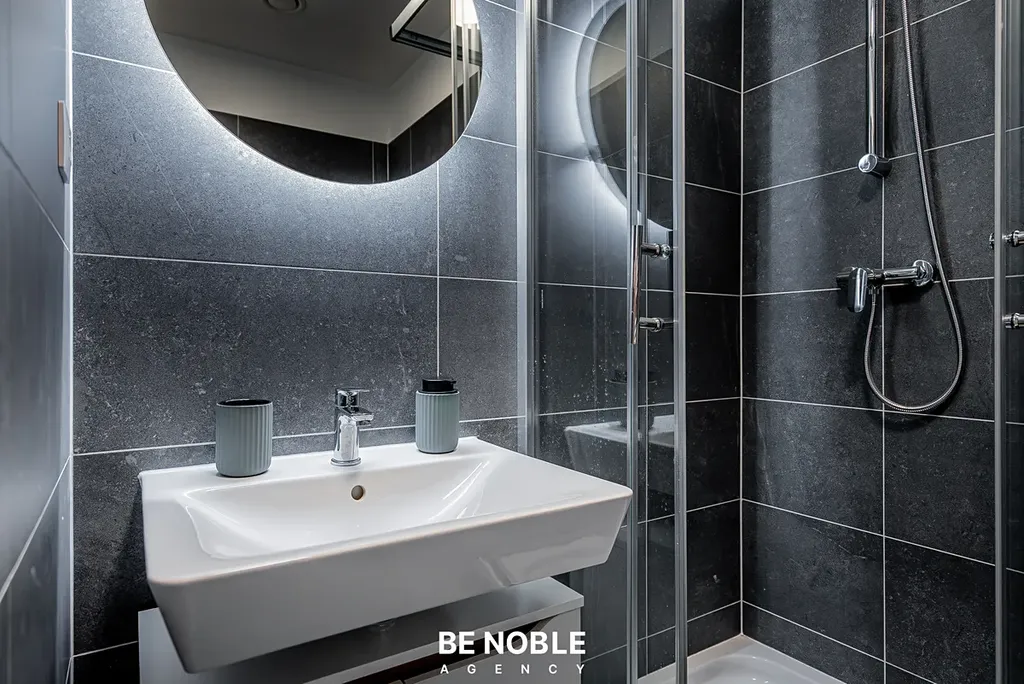 Byt je plně vybavený a připravený k okamžitému nastěhování. Součástí je moderní vestavěná kuchyňská linka s dostatkem úložných prostor, varnou deskou, lednicí, vestavěnou digestoří a mikrovlnnou troubou. Obytná část je zařízena kvalitní rozkládací pohovkou, komodou a jídelním stolem pro dvě osoby. Závěsy, záclony a designová svítidla dotvářejí příjemnou atmosféru. V předsíni před předáním proběhne instalace úložných prostor. Velké okno, kterým proudí spousta světla, a výhled do klidného zeleného vnitrobloku z 5. patra. Koupelna se sprchovým koutem, záchodem a umyvadlem. Pod umyvadlem je úložný prostor.