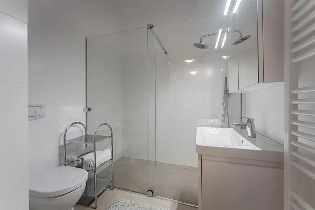 Interiér bytu je zařízený. Byt dispozičně nabízí vstupní chodbu (11,7m2), prostorný obývací pokoj (52,12m2) s moderním kuchyňským koutem vybaveným vestavěnými spotřebiči (lednice, mrazák, elektrická varná deska, trouba, digestoř, myčka), dvě samostatné ložnice (28,73m2 a 22m2), dvě stylové koupelny (jedna (5,12m2) s vanou, dvěma umyvadly a toaletou, druhá (4,17m2) se sprchovým koutem, umyvadlem a toaletou), a technickou místnost s pračkou a sušičkou. K bytu náleží sklep.