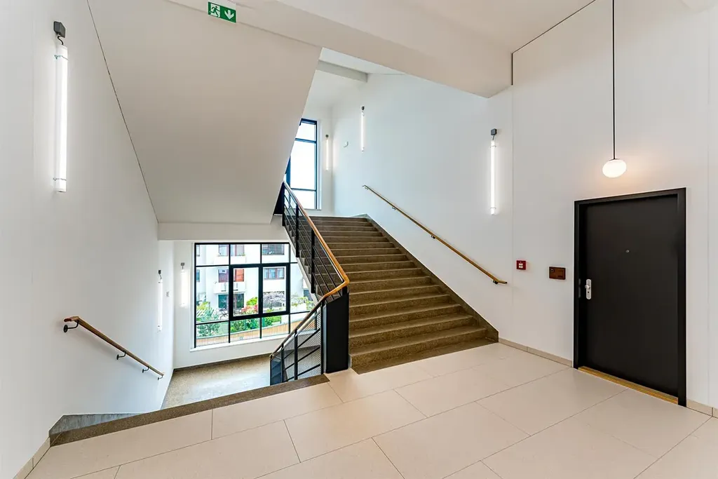 Vysoké stropy (4,75m), dřevěné podlahy, bezpolodrážkové interiérové dveře, sanita Laufen, zajímavé detaily a industriální prvky dotváří atmosféru tohoto atraktivního bydlení. Samozřejmostí jsou bezpečnostní vstupní dveře i chytrá domácnost. K dispozici je jedno parkovací stání v podzemních garážích v ceně nájmu.