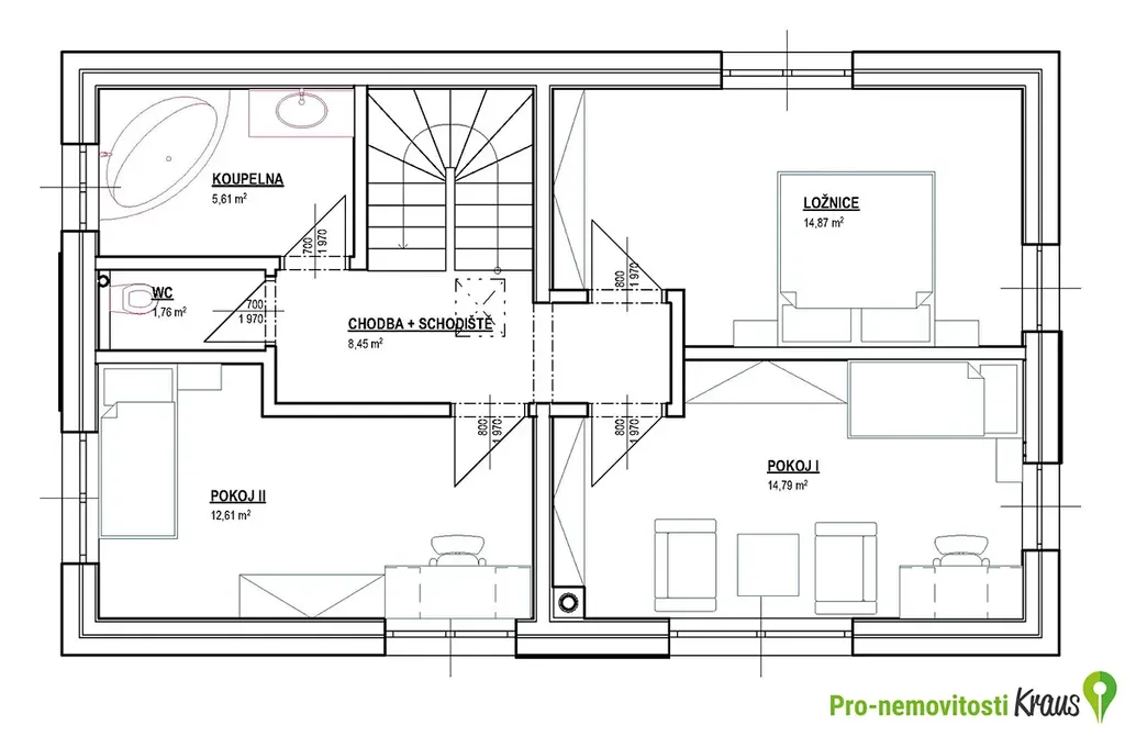 Stavba je nepodsklepená, v přízemí obývací pokoj s kuchyní, koupelna s WC, pracovna a technické prostory, v 1. patře 3 pokoje, koupelna a samostatné WC.
