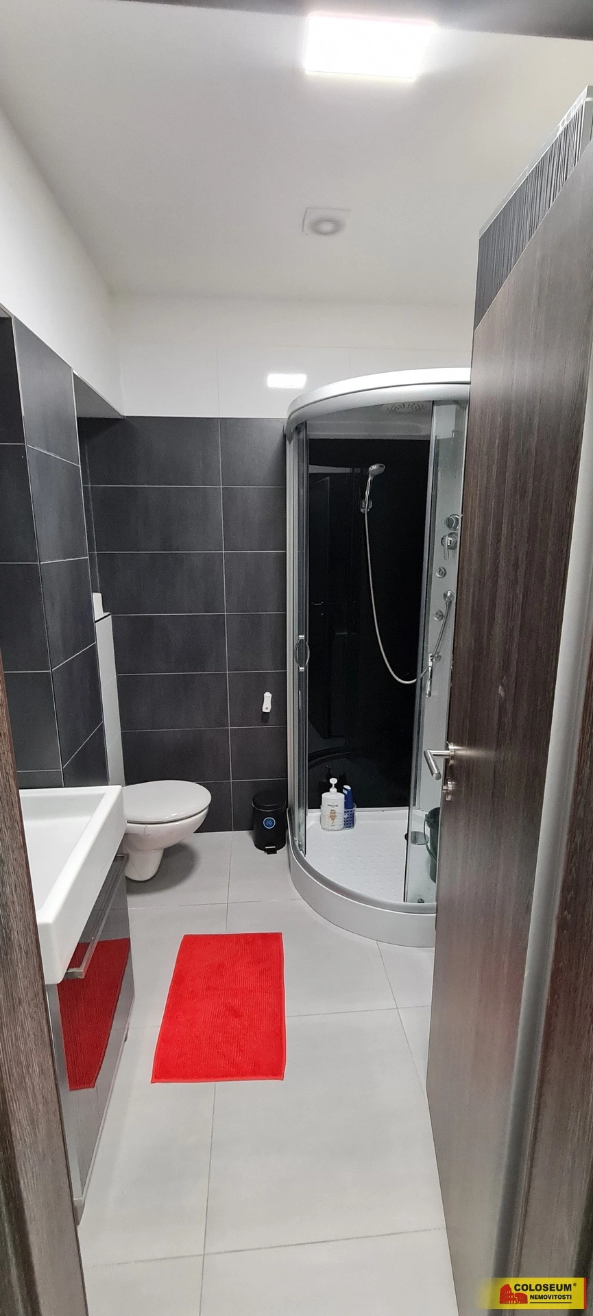 Koupelna je řešena ve vysokém standardu a působí velmi luxusním dojmem. Najdete zde prostorný sprchový kout 100×100 cm s termostatickou sprchovou baterií Grohe a tropickým deštěm, bezspárový velkoformátový obklad 3×1 m, designové umyvadlo CUBE se skříňkou a značkovou umyvadlovou baterii Grohe. Samozřejmostí je koupelnové zrcadlo s fazetou a bezdotykovým LED osvětlením, luxusní WC keramika Grohe, vysoká koupelnová skříňka, skleněné poličky a automatická pračka.