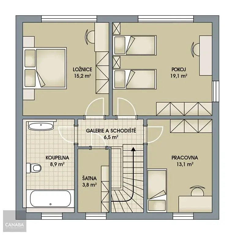 V přízemí naleznete vstupní halu, velkorysý obývací pokoj s kuchyňským koutem 34,9 m² s výstupem na terasu, pokoj pro hosty, koupelnu se sprchou a WC, hobby místnost a komoru. V patře jsou k dispozici další 2 pokoje, 1 ložnice, koupelna s vanou a WC a prostorná šatna.