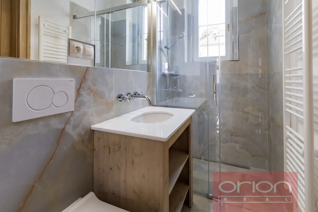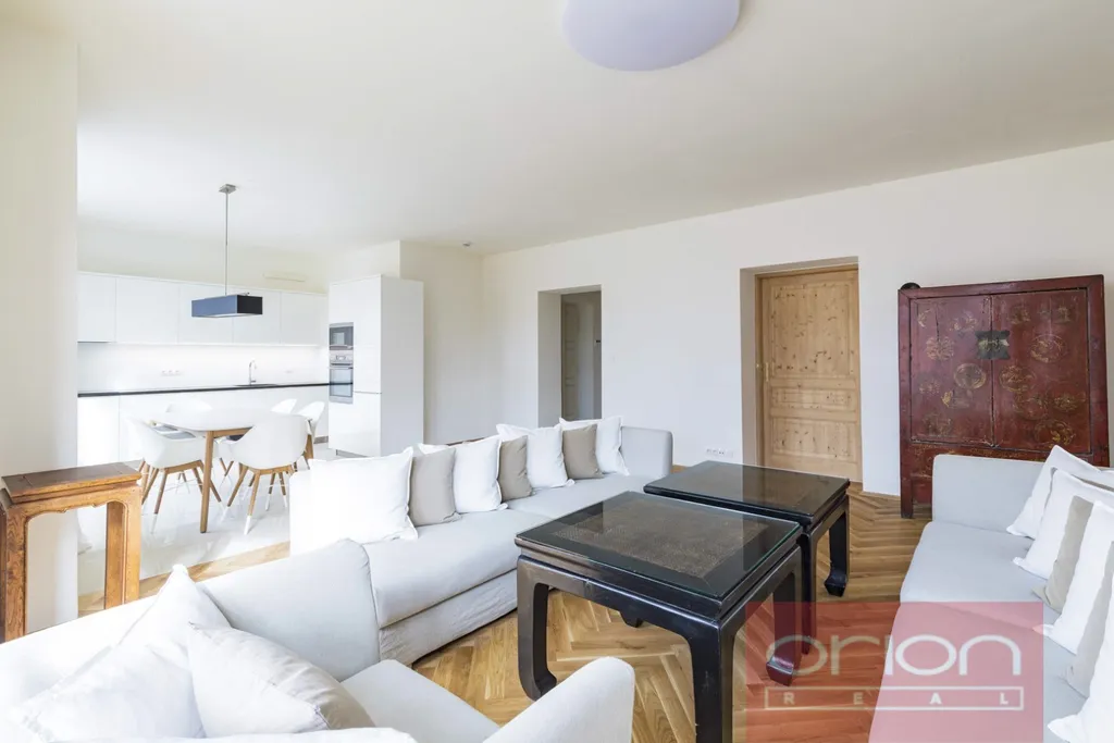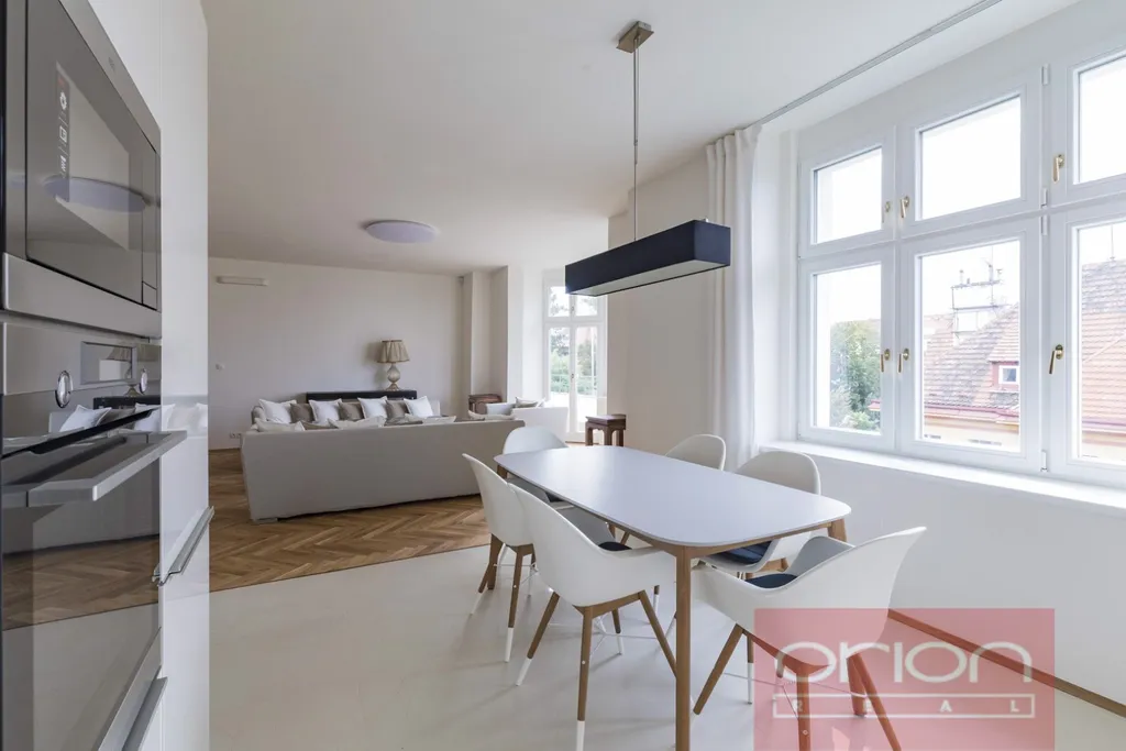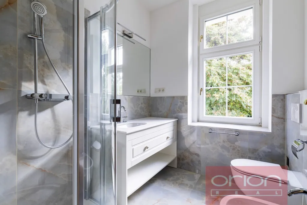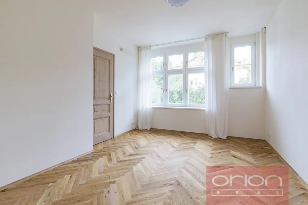 Nabízíme k pronájmu kompletně zrekonstruovaný, klimatizovaný byt v 1. patře rodinné vily se zahradou ve vyhledávané lokalitě Praha 10 - Vinohrady. Luxusní zařízený byt 4+1 má plochu 120 m2 a nabízí vstupní halu, plně vybavenou moderní kuchyň s jídelním koutem, prostorný a světlý obývací pokoj s velkými okny, s arkýřem a se vstupem na jižně orientovanou terasu o velikosti 10 m2, 3 ložnice, 3 koupelny (vana, sprchový kout, bidet, umyvadlo)), komoru. K vybavení bytu patří dřevěné parkety a mramorová dlažba s podlahovým vytápěním, pračka se sušičkou, klimatizace, alarm a samostatný plynový kotel. Dům se nachází v klidné vilové čtvrti, pouze pár kroků od tramvajové zastávky, 15 minut chůze ke stanici metra a nákupnímu centru Flora. Lokalita s velice dobrou dopravní dostupností MHD i autem, s veškerou občanskou vybaveností. V blízkém okolí množství obhodů, restaurací, bister, kaváren, nedaleko parků a městské zeleně.
