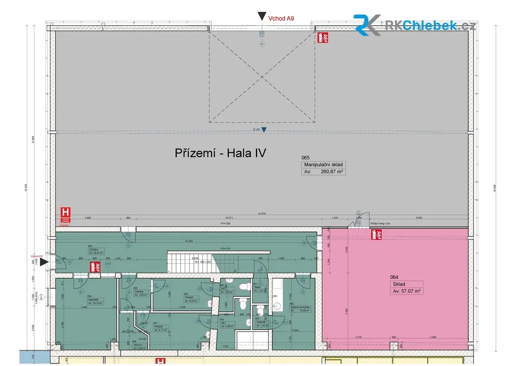 • sekční průmyslová vrata 6,0 × 5,2 m (vjezd kamionu – A9)