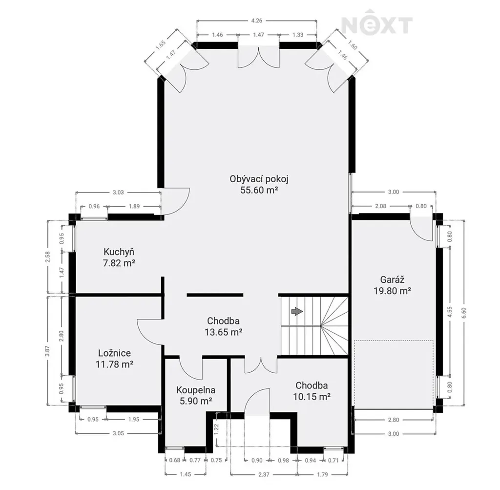 V patře se nacházejí čtyři samostatné pokoje, dvě koupelny a samostatné WC. Jeden z pokojů má přímý vstup na balkon umístěný nad hlavním vstupem do domu – ideální místo pro ranní kávu nebo tiché večerní nadechnutí.