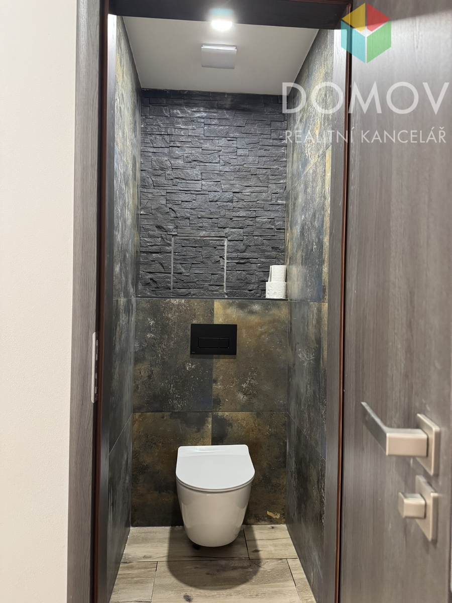 Součástí bytu je koupelna se sprchovým koutem a přípojkou na pračku i sušičku, samostatná toaleta a kuchyň s kuchyňskou linkou a přípojkou na myčku (bez lednice).