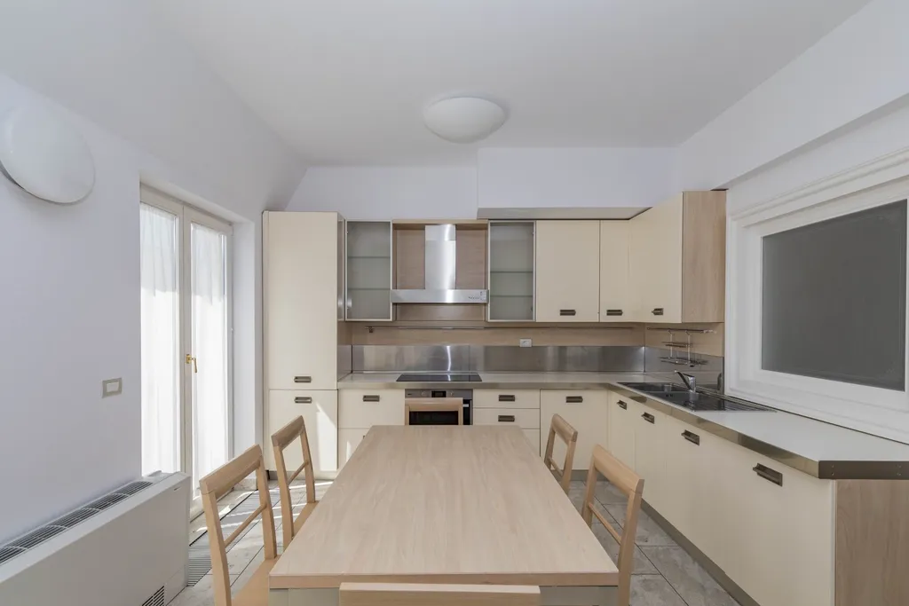 Nabízíme k pronájmu reprezentativní mezonetový byt 5+1 s terasou v 5. a 6. patře renovovaného neorenesančního činžovního domu s výtahem ve vyhledávané lokalitě Prahy 5 na rozhraní Malé Strany a Smíchova. Byt má celkovou plochu 286 m² a nabízí ve spodním patře vstupní předsíň, prostorný obývací pokoj, plně vybavenou kuchyň se spotřebiči (sklokeramická varná deska, trouba, lednice, myčka a mikrovlnná trouba), 1 ložnici s vlastní koupelnou s vanou, sprchou, toaletou a bidetem, šatnou a vstupem na balkon. Další dvě ložnice, obě se vstupem na balkon, 1 koupelnu s vanou, toaletou a bidetem, malou šatnu a komoru. V horním patře je otevřená místnost s možností využití jako ložnice pro hosty nebo herna pro děti, 1 koupelna se sprchou, toaletou a bidetem, prádelna s pračkou a sušičkou a terasa o velikosti 35 m² s pergolou, posezením s dechberoucím výhledem na Petřín a Pražský hrad. Byt je částečně zařízený a k jeho vybavení patří jídelní stůl a židle, postel a vestavěná skříň v ložnici, vybavená šatna, závěsy, regály v koupelně, klimatizace, alarm, videotelefon, bezpečnostní dveře, dřevěné parkety, mramorové podlahy v koupelnách, plynové topení. Na terase je venkovní nábytek a pergola, k rostlinám na terase je zaveden i systém zavlažování. V domě je denní recepce a možnost využít služeb údržbáře. K bytu náleží sklep. Perfektní poloha naproti Petřínským sadům, v docházkové vzdálenosti od Pražského hradu, Karlova mostu, Malostranského náměstí. V okolí domu je veškerá občanská vybavenost : restaurace, kavárny, bistra, obchody, zdravotnická zařízení. Jen pár kroků od Francouzského lycea, stanice tramvaje, metra Anděl a nákupního centra Nový Smíchov. Autem blízký nájezd na Pražský okruh a dálniční síť. Parkovací místo v garážích na zakladači vhodné pro nízká auta s výškou do 150 cm přímo v domě za extra poplatek 3.900 Kč + DPH/měsíc. Pro větší vozy je možné využít parkování v Drtinově ulici za extra poplatek. K bytu patří sklep. K dispozici ihned. Nájemce bytu má možnost stát se za poplatek členem wellness klubu Elliptico v rezidenci Ellipsis v Holečkově ulici.