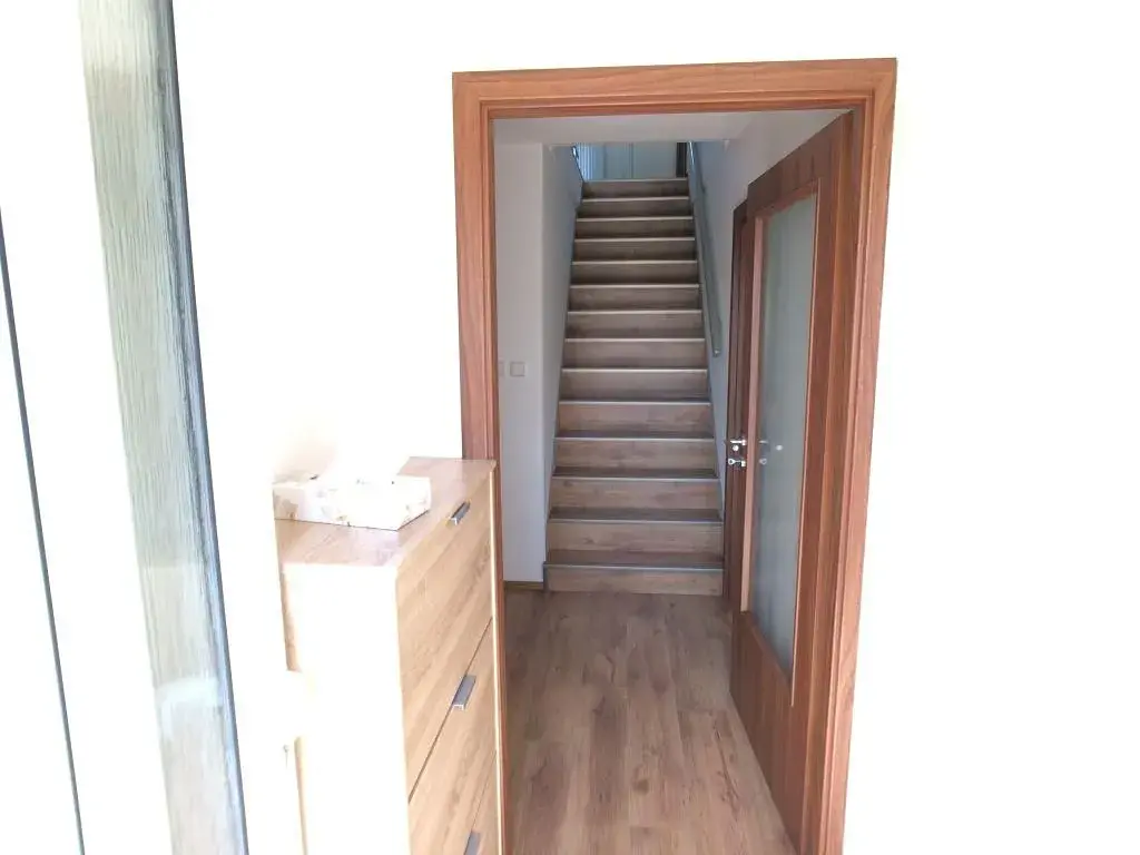 v patře vstupní hala se zádveřím, prostorný obývací pokoj, samostatná plně vybavená kuchyň, lednice, myčka, varná deska a trouba, dále toaleta a místnost na pračku,