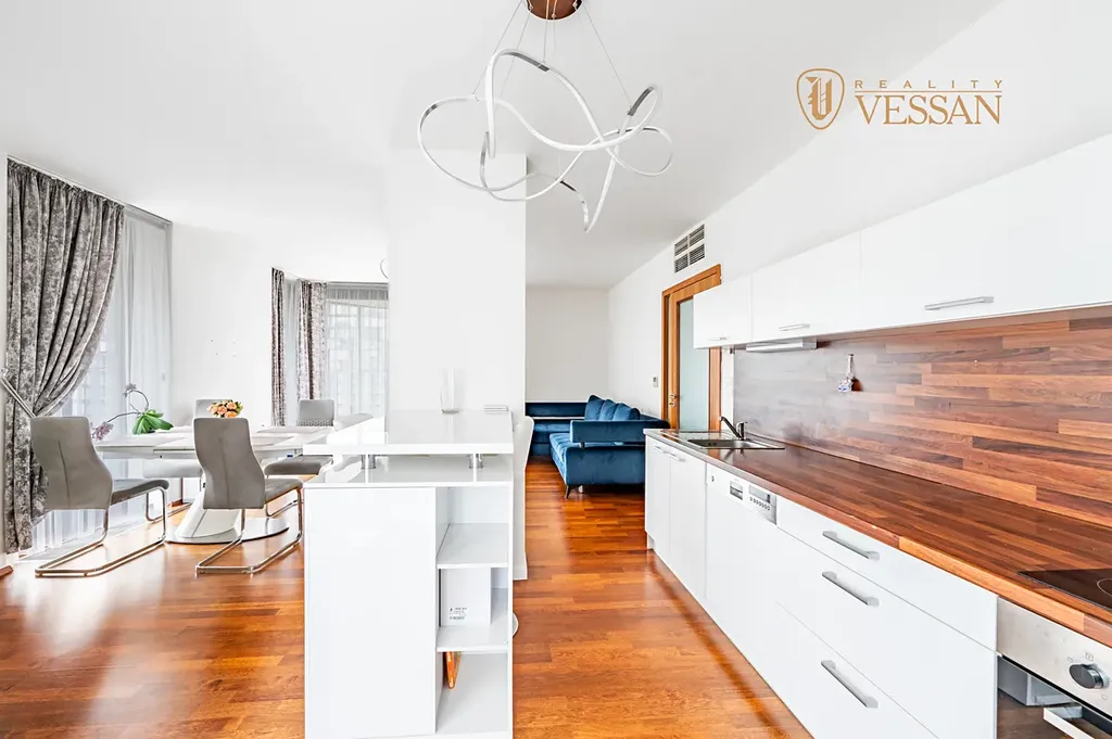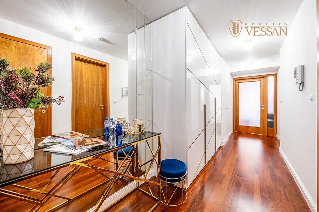 Bytová jednotka s podlahovou plochou 82,3 m² se nachází v 8. nadzemním podlaží udržovaného bytového komplexu Central Park. Byt sestává z prostorného obývacího pokoje, kuchyně s kuchyňskou linkou včetně vestavěných spotřebičů, ložnice, koupelny s vanou, samostatného WC, předsíně s dostatkem úložných prostor a velké terasy (20,8 m²). Na podlahách je položena dřevěná podlaha. K bytu náleží parkovací stání v podzemních garážích a sklep.