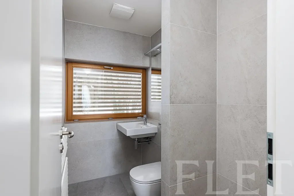 Koupelna je vybavena sprchovým koutem a toaletou, k dispozici je také samostatná toaleta a praktická technická místnost / prádelna určená pro pračku a sušičku. V předsíni se nachází velká vestavěná skříň s nadstandardním množstvím úložného prostoru.