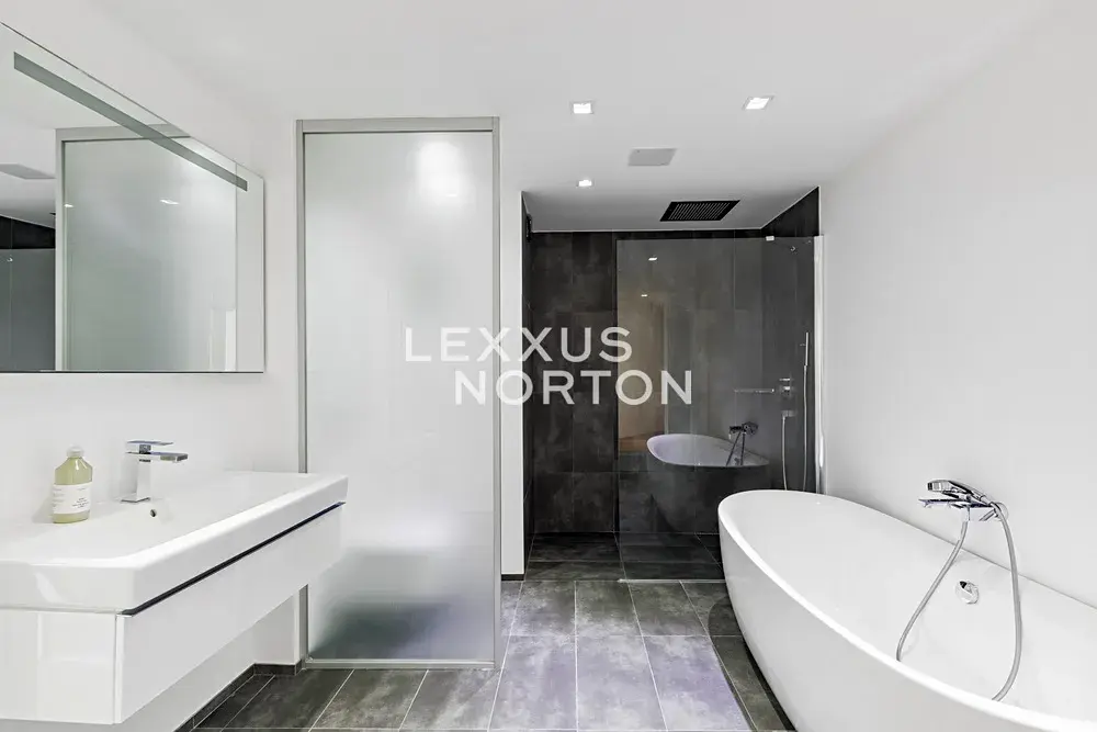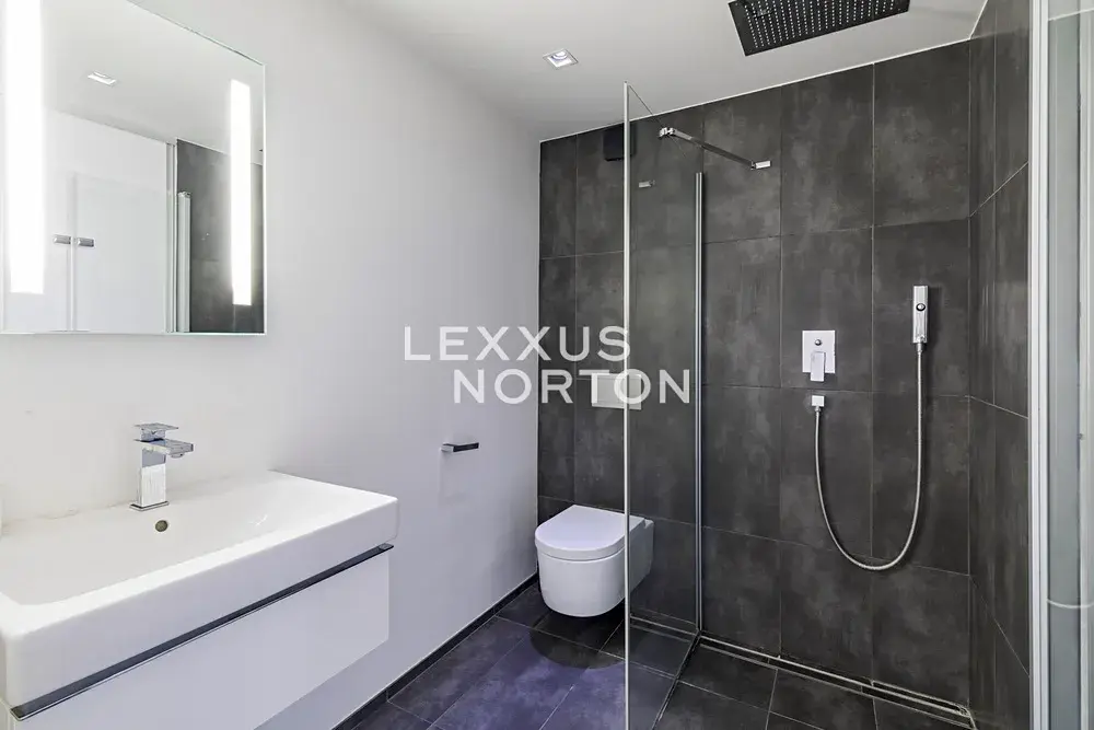 Kuchyňský kout je plně vybaven sklokeramickou varnou deskou, troubou, lednicí s mrazákem, myčkou nádobí a mikrovlnnou troubou. Byt nabízí dvě koupelny, obě se sprchovým koutem, vanou a toaletou, přičemž jedna z nich je řešena jako en-suite. Součástí bytu je rovněž praktická šatna. Na vyvýšené galerii se nachází koupelna se sprchovým koutem. Byt je plně klimatizovaný a vybaven inteligentní domácností, kterou lze pohodlně ovládat přes mobilní telefon. Možnost pronájmu parkovacího stání v blízkosti bytu. Tento mezonet je ideální volbou pro ty, kteří hledají moderní bydlení s dostatkem prostoru a s jedinečným výhledem.