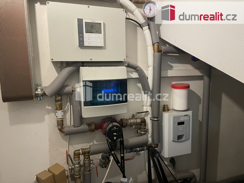 Vytápění v domě řešeno tepelným čerpadlem v kombinaci s krbovou vložkou s výměníkem, ohřev TUV boilerem TČ, dále v domě nainstalována 2 x klimatizační jednotka ( přízemí + 1 NP ). Voda do objektu přivedena z obecního vodovodu + domovní čistírna pitné vody, splašková voda svedena do obecní tlakové kanalizace.