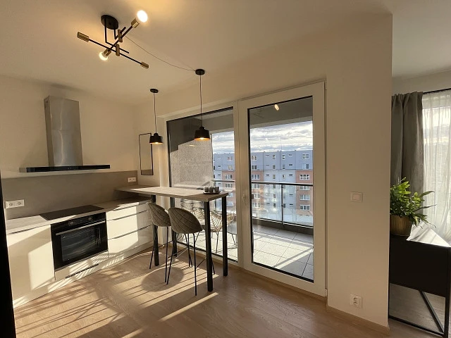 Moderní bydlení, vonící novotou, s větším monožstvím denního světla. Pěkně zařízený byt, ve vyšším patře; Ložnice mají venkovní žaluzie; Prostorná koupelna; 2x WC; Zařízený nábytkem. Moderní, praktická kuchyně, vybavená sklokeramickou varnou deskou, troubou na pečení, lednice a mrazák, myčka nádobí. Dále v bytě je: pračka prádla a sušička. K bytu, pro Vaše pohodlí je garážové stání a sklep. Internet možný od lokálního poskytovatele. Volný od 15.3.2026.