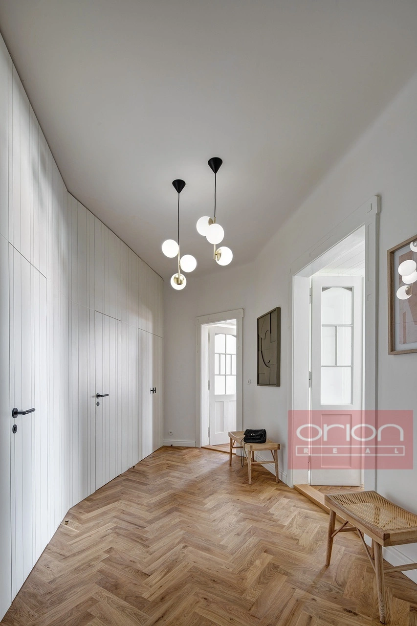 Nabízíme k pronájmu luxusní, plně zařízený byt 3+kk o velikosti 86 m² v bytovém domě s výtahem, nacházející se ve vyhledávané lokalitě Praha 6 - Dejvice, v krátké pěší vzdálenosti od stanice metra a tramvaje Hradčanská. Byt disponuje plně vybavenou kuchyní s jídelním koutem, prostorným obývacím pokojem, dvěma ložnicemi, šatnou, dvěma koupelnami se sprchovým koutem a toaletou a navíc samostatnou toaletou. K vybavení patří pračka, sušička, Wi-Fi a zabezpečovací systém. Na podlahách jsou kvalitní parkety. Z oken je krásný výhled na Dejvické střechy, oblíbený park Stromovka je vzdálen pouhých 10 minut pěšky. Lokalita nabízí kompletní občanskou vybavenost, množství restaurací, bister a lokálních obchodů. Výborná dopravní dostupnost jak MHD (metro i tramvaj 1 minutu chůze od domu), tak autem do centra města, na letiště i do mezinárodních škol.