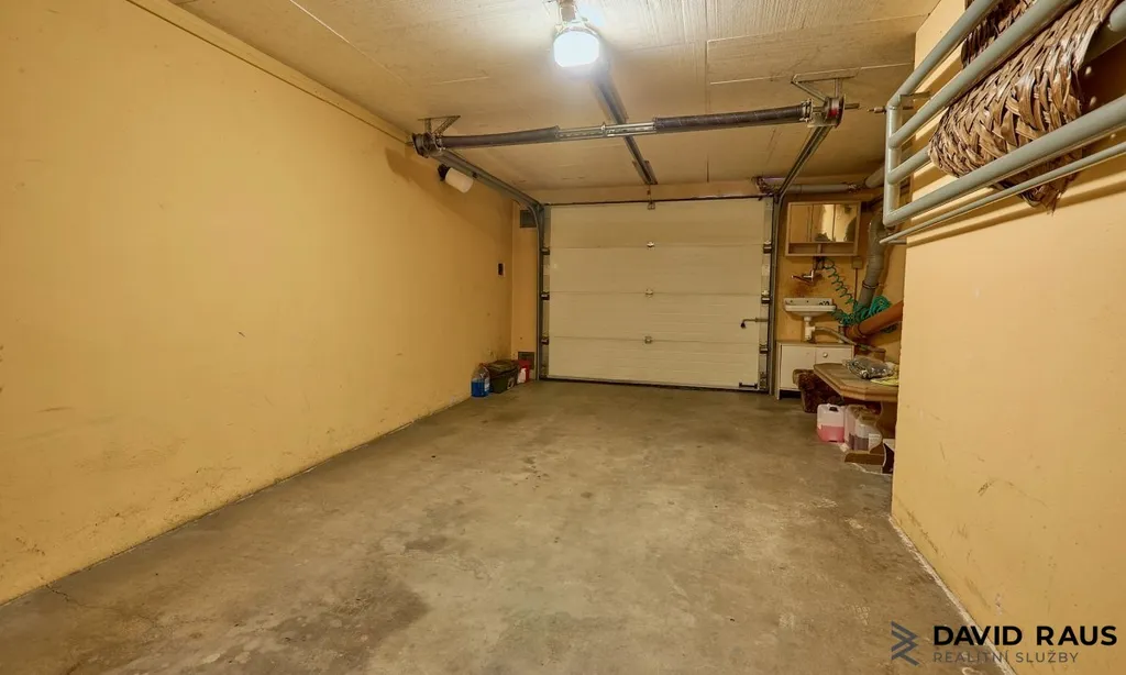 Dům je kompletně podsklepený a nabízí několik samostatných místností: dva sklepy (6,40 m² , 6,50 m²), prádelnu (15,60 m²) se vstupem do zahrady (158 m²), kotelnu (10,8 m²), předsíň (7,8 m²) a garáž (20,5 m²) s vjezdem z hlavní ulice.