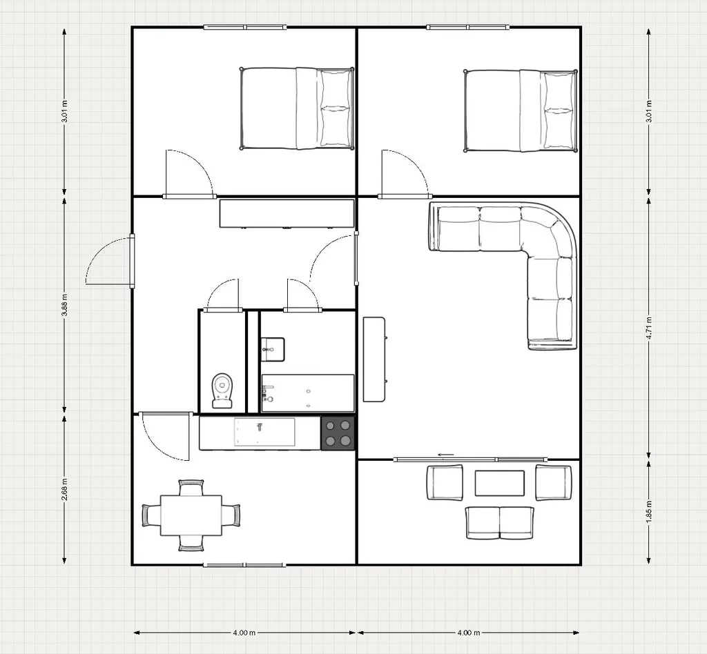 Dispozičně se skládá ze vstupní předsíně o výměře 9 m, ze které je přístup do všech místností. Dominantou bytu je prostorný obývací pokoj o velikosti 19 m. Dále byt nabízí dvě ložnice, každá o výměře 12 m. Kuchyně o nadstandardní výměře 11 m je dostatečně prostorná pro umístění jídelního stolu. Samostatné WC a koupelna zajišťují komfortní bydlení.