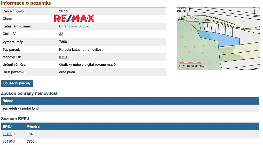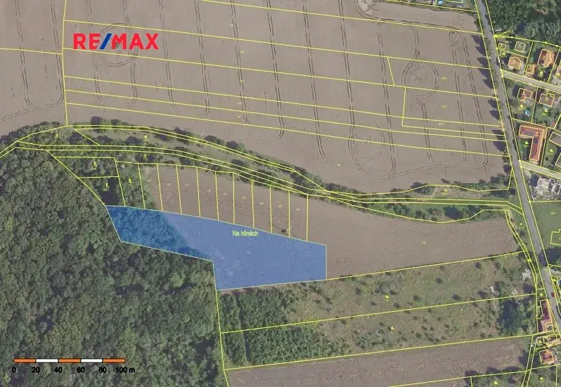 Výměra pozemku činí 7 898 m² a je veden v katastru nemovitostí jako orná půda. Zalesněná malá část na mapě je náletový les, který lze vykácet.