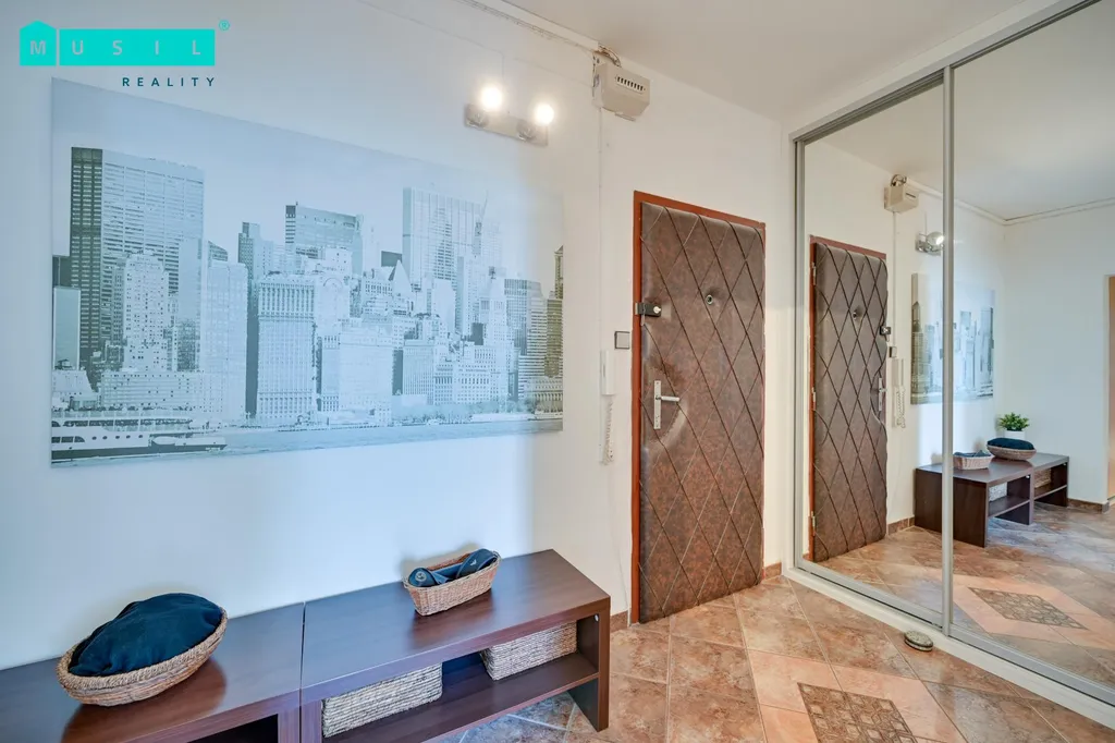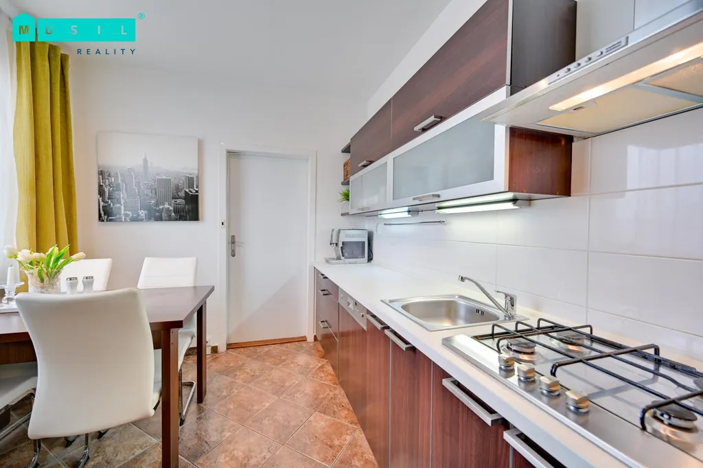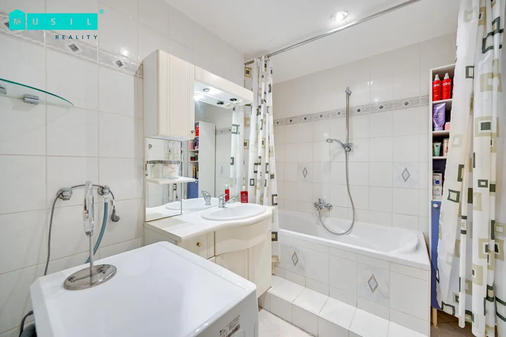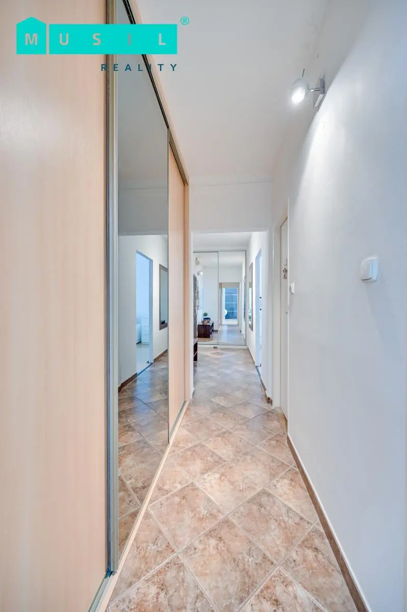 Dispozice bytu zahrnuje obývací pokoj se vstupem na lodžii, samostatnou kuchyni vybavenou spotřebiči značky Whirlpool (myčka, trouba, plynový sporák, digestoř, mikrovlnná trouba, vestavná lednice s mrazákem), dva další pokoje, koupelnu s vanou a samostatné WC. Praktickým benefitem jsou vestavěné skříně v předsíni i v jednom z pokojů, které zajišťují dostatek úložného prostoru. K bytu náleží také sklepní kóje.
