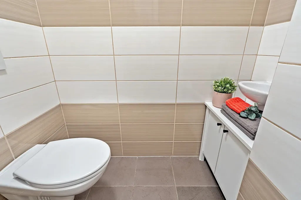 Byt disponuje kompletně zařízenou kuchyňskou linkou se všemi spotřebiči (sklokeramická deska, elektrická trouba, myčka, odsavač, mikrovlnná trouba, lednice), je klimatizován, což je velkou výhodou v horkých letních dnech, ale i v rámci přitápění v těch studených zimních. Vytápěn je pomocí plynového kotle, který stejně tak zajišťuje ohřev vody. Byt se pronajímá téměř kompletně zařízen nábytkem, který je součástí ceny za pronájem. V koupelně najdeme sprchový kout, toaleta je samostatná s vlastním umyvadlem.