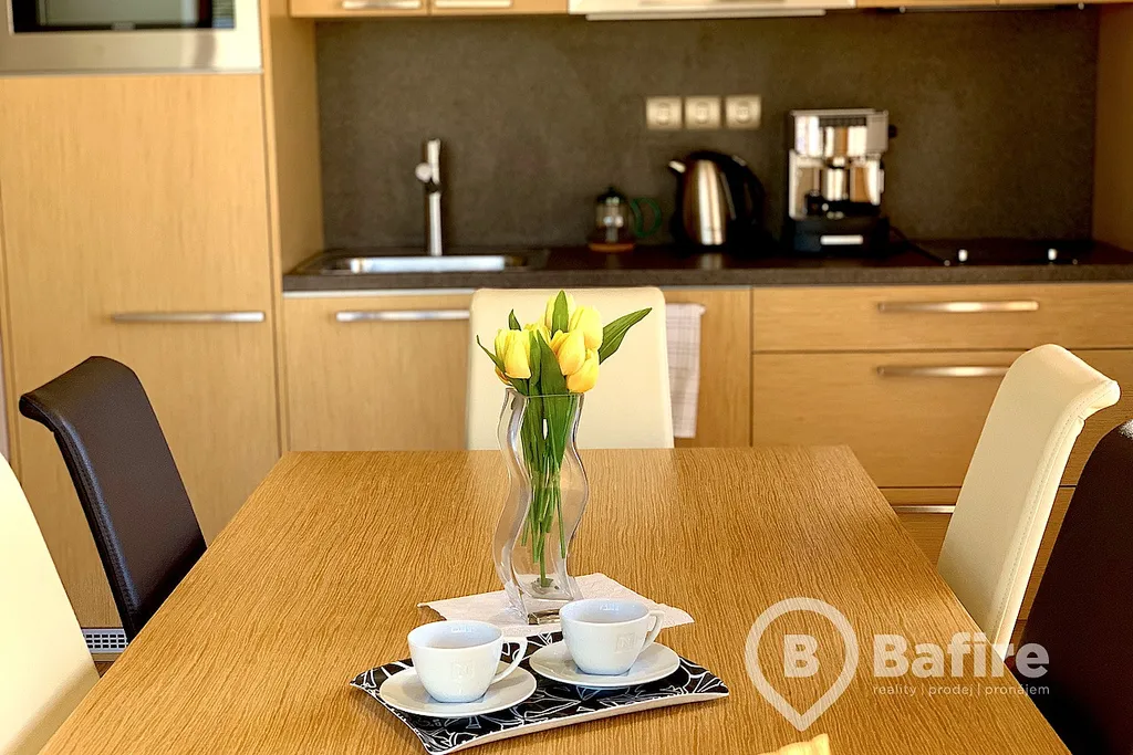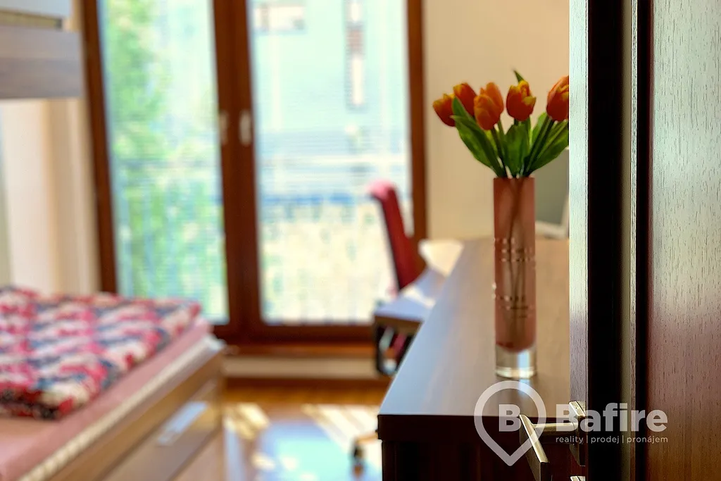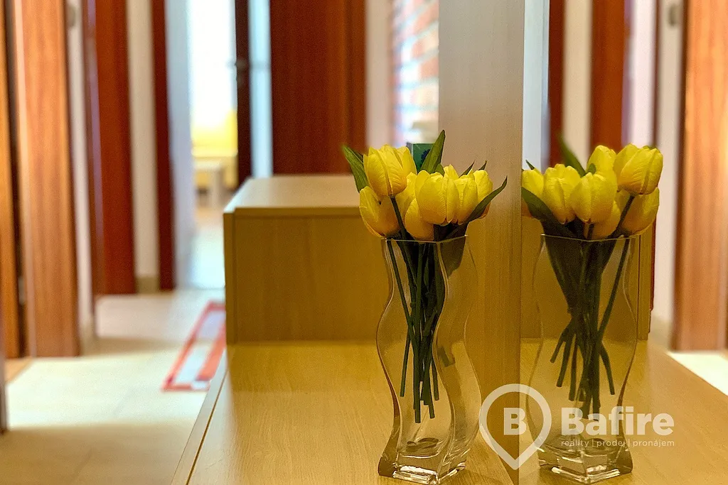 Jedná se o velice dobře řešený byt, který má 2 samostatné ložnice a obývací pokoj s plně vybaveným kuchyňským koutem. V koupelně, která je přístupná z chodby, se nachází vana se skleněnou zástěnou, umyvadlo včetně zrcadla s osvětlením a také pračka. WC je samostatně. Byt rovněž disponuje velkým množstvím úložného prostoru, jako jsou věstavěné skříně či komody. Byt se pronajímá plně vybavený tak, jak je možné vidět na fotografiích.