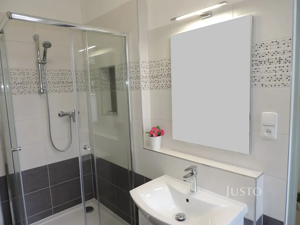 Dále je zde nová koupelna se sprchovým koutem a umyvadlem a místem pro pračku. Toaleta je řešena samostatně. V bytě jsou nové vinylové podlahy a plastová okna s venkovními žaluziemi. K dispozici zázemí cihlového domu se zahradou. Nájem 9.900,- Kč plus energie, dle počtu osob a spotřeb.