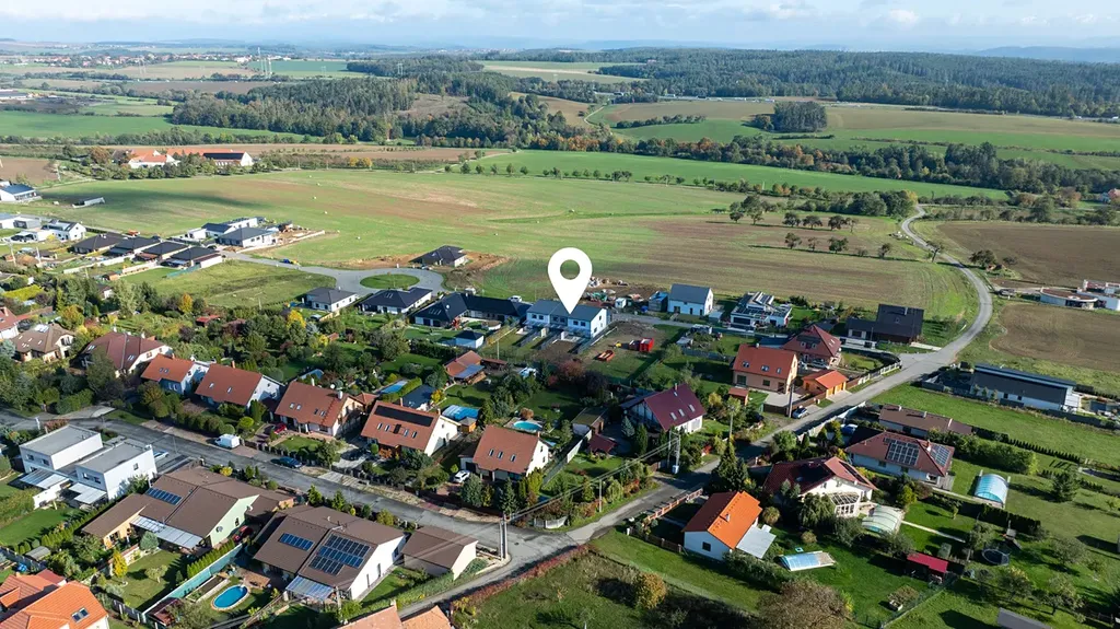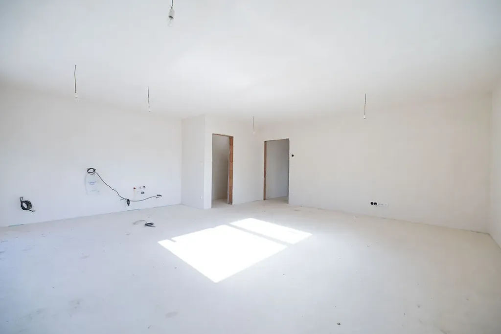 Dům je těsně před kompletním dokončením na klíč vyjma finálního povrchu podlah (vinyl, plovoucí podlaha atd.), obkladů, dlažby a sanity v koupelně a interiérových dveří.