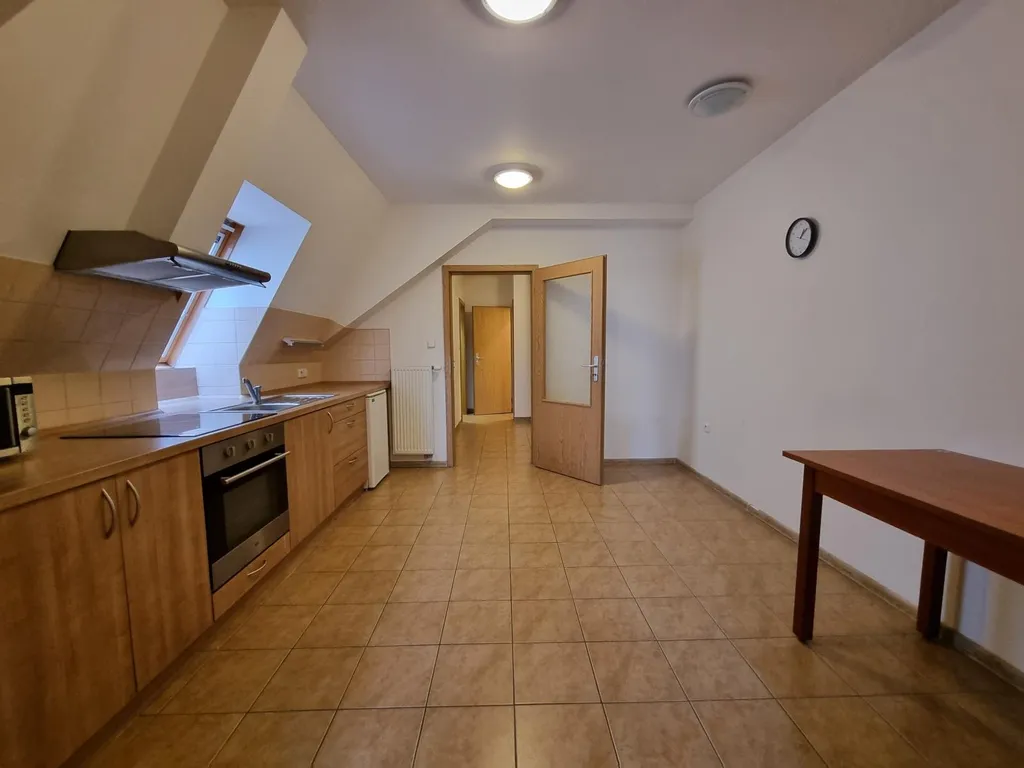 Byt je částečně zařízený. Kuchyně kompletně vybavená spotřebiči včetně ledničky.