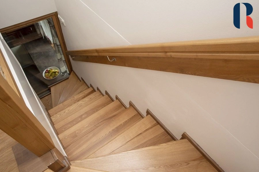 Po vstupu do domu projdete zádveřím, které je od dalších prostor odděleno dveřmi. Nachází se zde vestavěné skříně, botník a zároveň slouží k zamezení úniku tepla z domu. Za zádveřím je chodba a z ní přístup do obývacího pokoje s kuchyňským koutem, jídelny, ložnice, koupelny a technické místnosti. Vstup do koupelny s vanou, wc a bidetem je ze zádveří i z ložnice. V horním patře se nachází naproti sobě dva samostatné pokoje a uprostřed koupelna se sprchovým koutem a wc.