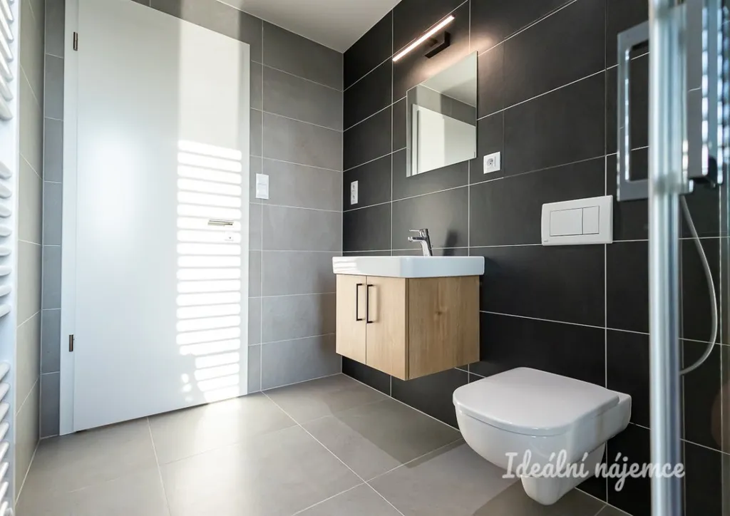 Koupelna je vybavena sprchovým koutem, umyvadlem a bude dovybavena pračkou.