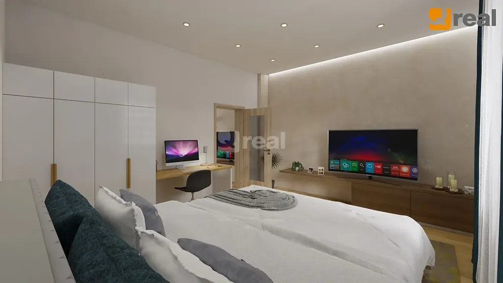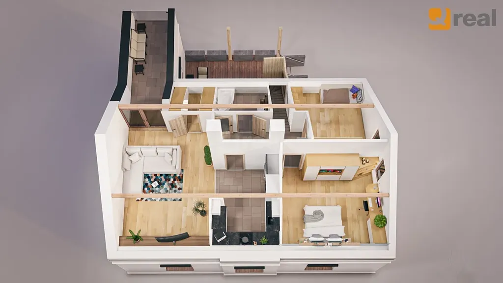 Přízemí je rozděleno na dva byty 2+1 se společnou prostornou verandou a přes tuto je pak vstup po schodech do podkroví o vel. 3+1 s balkonem a komorou. Lze zde vybudovat terasu se vstupem přímo z obývací části.