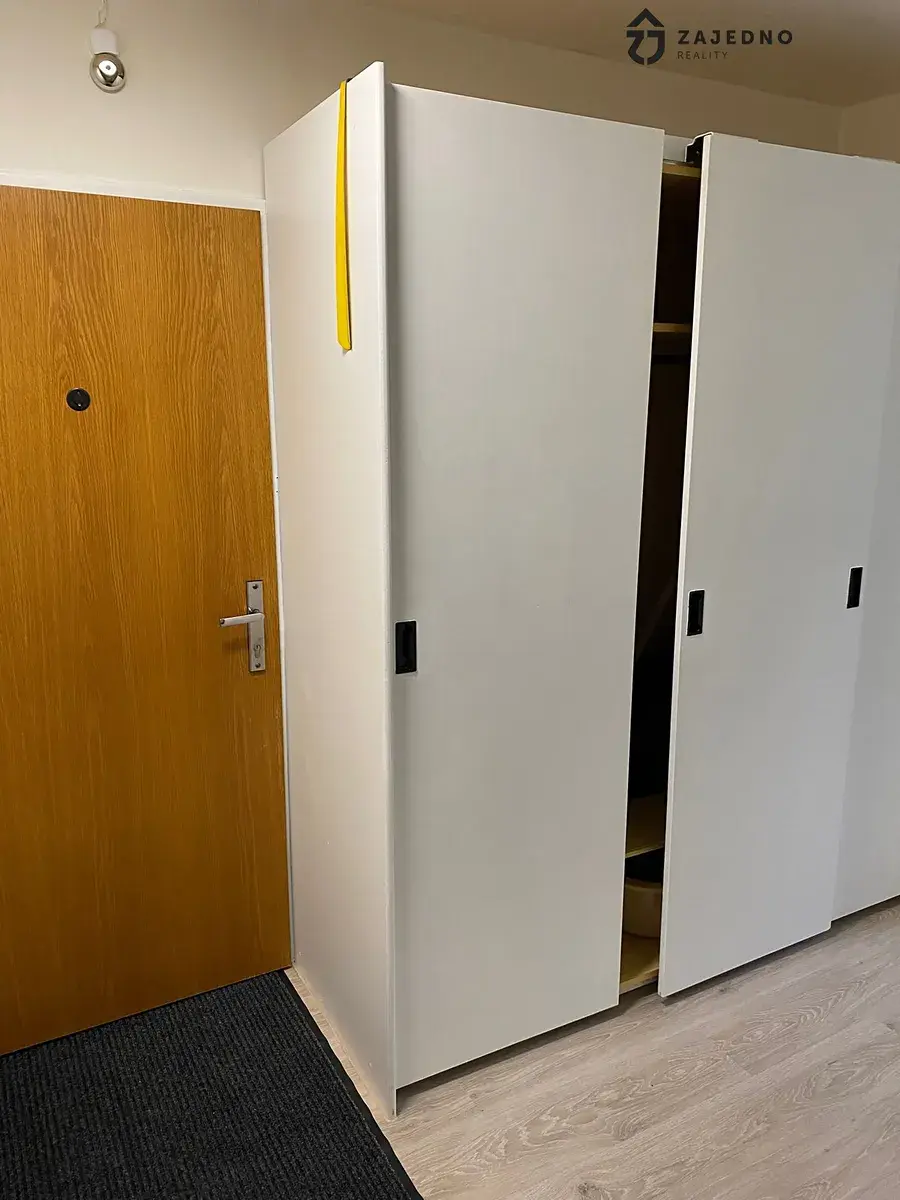 Při vstupu do bytu se nachází předsíň s úložnými skříněmi. Z předsíně je vstup do spíže, koupelny, samostatné toalety a dále do obývacího pokoje s lodžií.