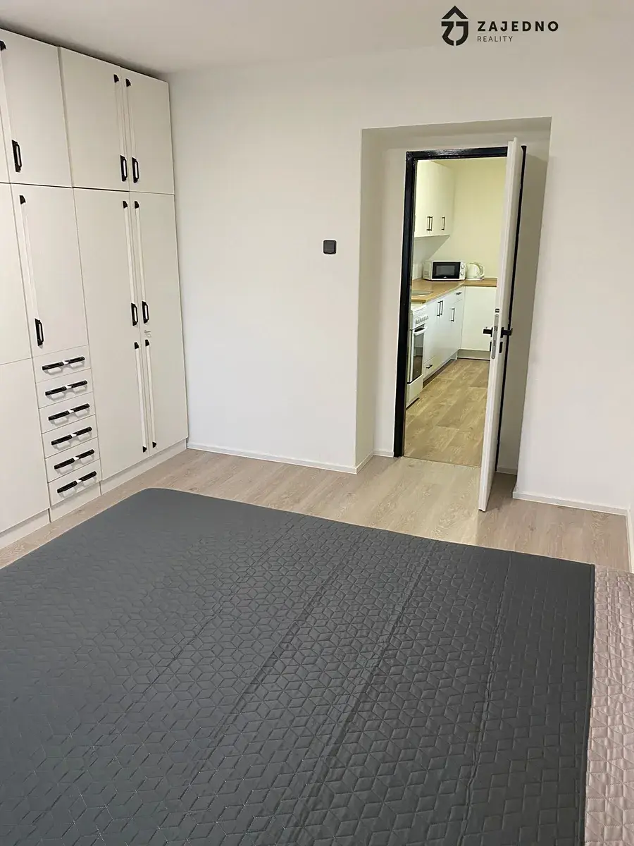 Kuchyně je vybavena novou kuchyňskou linkou, sporákem, lednicí, mikrovlnou troubou. Z kuchyně je vstup do ložnice, která je zařízena manželskou postelí a obývací stěnou.