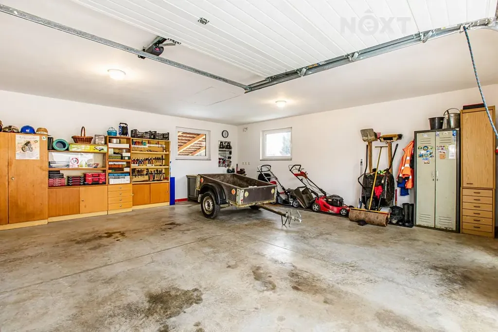 Předností bungalovu je i samostatná prostorná garáž pro dvě auta, která je současně využívána jako dílna a nabízí dostatek místa pro hobby či skladování. Ke garáži je příjezd po dlážděné cestě. Za garáží se nachází zastřešená pergola s příjemným výhledem do zahrady a na věž místního kostela, ideální místo pro posezení a relaxaci. Pergola je situovaná za západ.