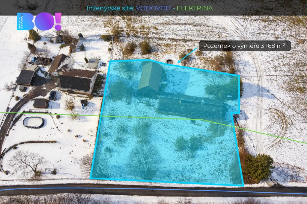 Pozemek má zajištěný přístup z veřejné komunikace, inženýrské sítě jsou v dosahu (vodovod, elektřina). Na pozemku se nachází stávající stavba určená ke kompletní rekonstrukci nebo demolici, která není hlavním předmětem prodeje – rozhodující je hodnota pozemku a jeho budoucí využití.
