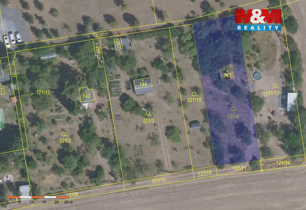 Na pozemku se nachází podzemní sklep. Připojení vody a elektřiny bude zajištěno pomocí věcného břemene přes vedlejší parcelu č. 121/3, která je rovněž ve vlastnictví prodávajícího. Kanalizaci lze vyřešit pomocí akumulační bezodtokové jímky nebo domovní ČOV.