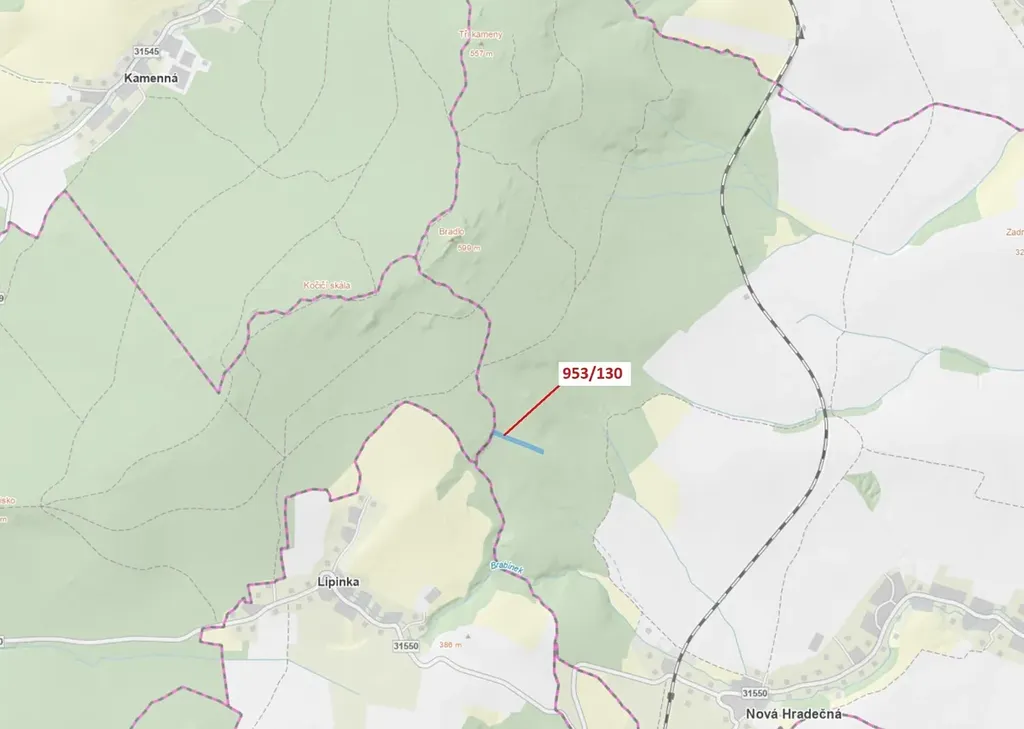 Lesní pozemek o výměře 5079 m2, parcelní číslo 953/130, podíl 1/1, katastrální území Nová Hradečná, obec Nová Hradečná, obec s rozšířenou působností Uničov, okres Olomouc, Olomoucký kraj.