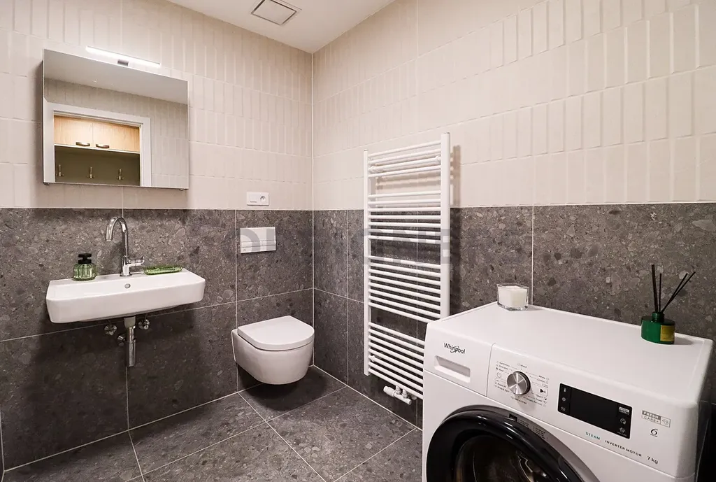 Koupelna vyniká elegantním designem a praktičností, kromě vany, umyvadla a WC je zde umístěna také pračka.