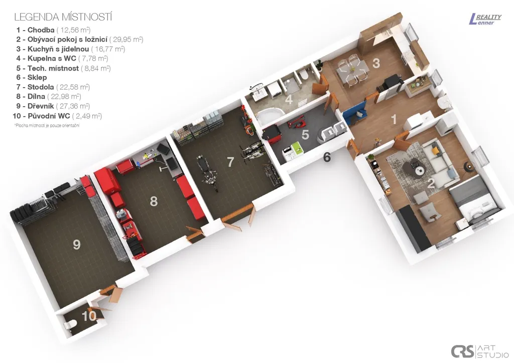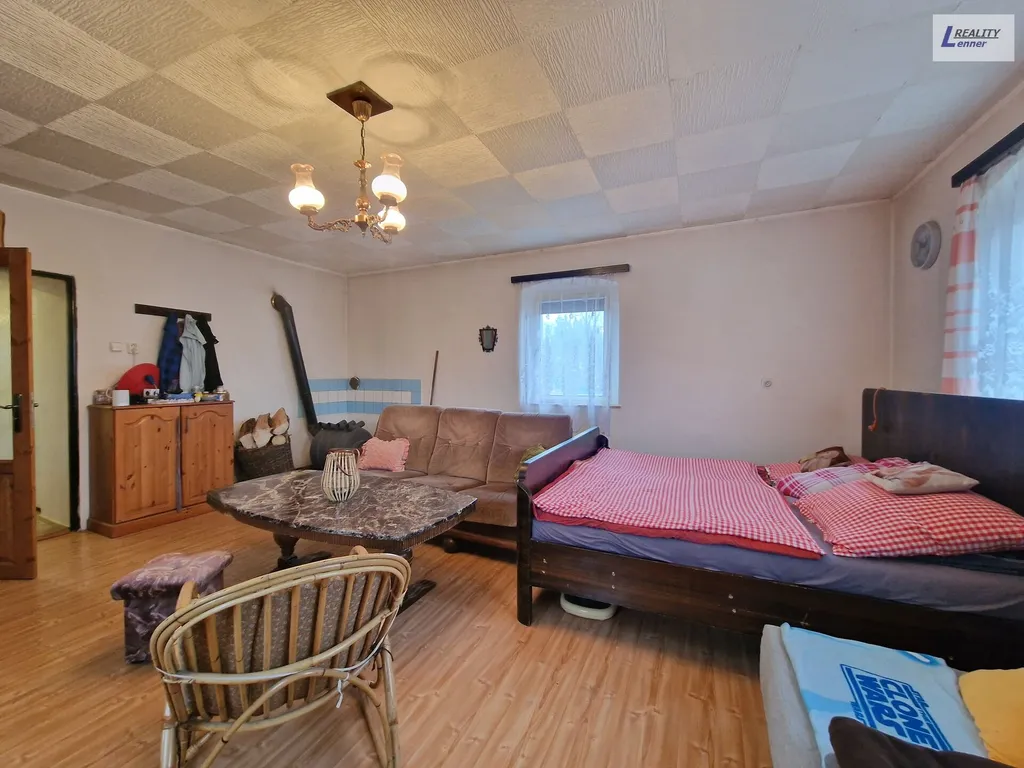 chodba, obývací pokoj s ložnicí (lze případně rozdělit), kuchyně s jídelnou, koupelna s WC, technická místnost, sklep. Dále stodola/garáž, dílna, dřevník, původní suché WC (nyní sklad nářadí). Nad celým objektem se nachází velká půda vhodná k případné půdní vestavbě.