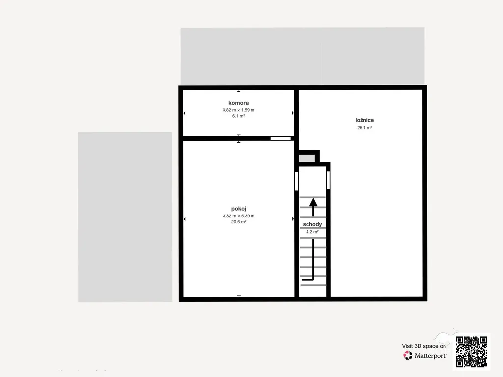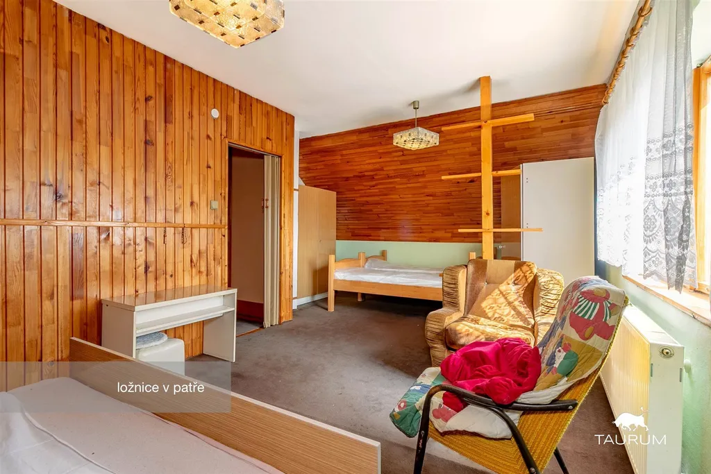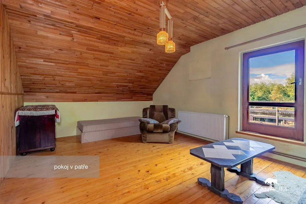V patře jsou 2 pokoje, podkrovní komora, a vstup na půdu (po žebříku).