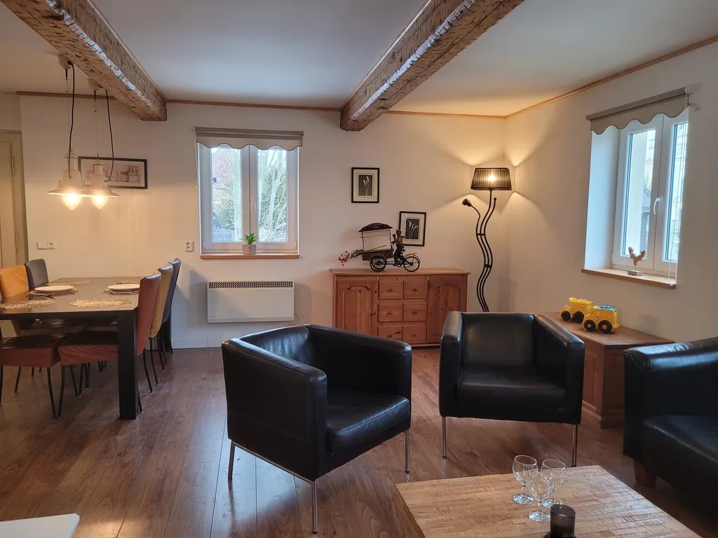 Obývací pokoj nabízí prostornou sedací část a otevřenou kuchyni s jídelním stolem pro 6 osob. Kuchyň je vybavena myčkou nádobí, elektrickou varnou deskou, chladničkou s mrazákem a mikrovlnnou troubou. Koupelna disponuje komfortní vanou a samostatným sprchovým koutem. Z koupelny je vstup do technické místnosti s bojlerem a pračkou.