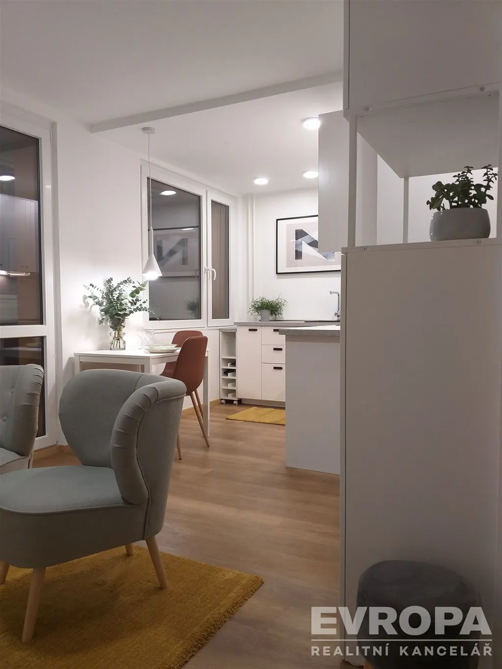 Interiér bytu byl navržen interiérovou designérkou s důrazem na maximální využití prostoru a komfort bydlení. Dispozice je promyšleně rozdělena na obývací část s kuchyňským koutem, klidovou zónu určenou ke spaní a moderní koupelnu se sprchovým koutem a toaletou. I přes kompaktní metráž nabízí byt plnohodnotné a pohodlné bydlení, ideální pro jednotlivce, pár nebo jako investici k pronájmu.