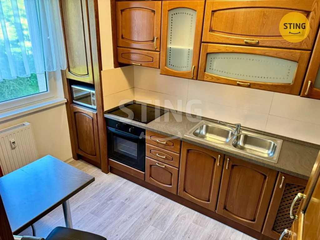 Kuchyně je vybavena kuchyňskou linkou s vestavěnými spotřebiči (trouba, elektrický sporák a lednice s mrazákem), mikrovlnnou troubou, stolem se dvěma židlemi a přípojkou na pračku. V obývacím pokoji se nachází gauč, konferenční stolek, televizní stolek, policová skříň a koberec. V ložnici je šatní skříň, postel (160 cm) včetně pružinové matrace a noční stolek. Koupelna je vybavena vanou, umyvadlem a skříňkou. WC je odděleno přepážkou. Na chodbě jsou stropní skříňky, botník a věšák. V celém bytě je na podlaze položeno linoleum. Majitel preferuje nájemníka bez domácího mazlíčka.