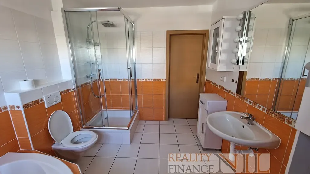 2 NP: tři pokoje, šatna, předsíň, koupelna s vanou i sprchovým koutem a WC a balkon.