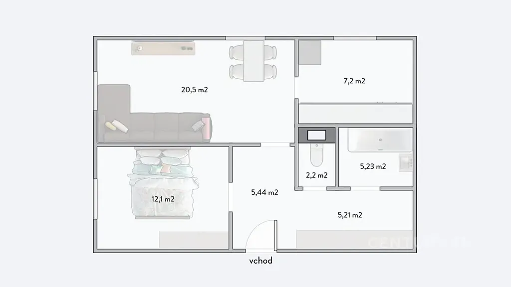 Byt o výměře 57,88 m² se nachází v 1. podlaží moderního bytového domu s výtahem, který byl kolaudován v roce 2012. Dispozice je promyšlená a velmi příjemná – vstupní předsíň plynule navazuje na šatnu s velkou vestavěnou skříní, nechybí světlý obývací pokoj s kuchyňským koutem, samostatná ložnice, koupelna s vanou a oddělená toaleta. K bytu náleží také sklep o velikosti 3,2 m².