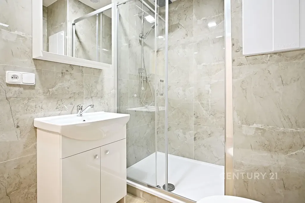 • Stylová koupelna se sprchovým koutem, velkoformátovými obklady se vzorem mramoru, novým sanitárním vybavením, skříňkou pod i nad umyvadlo a WC