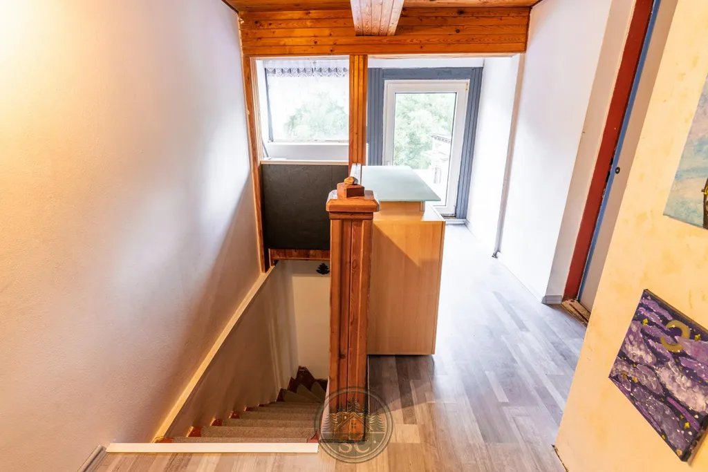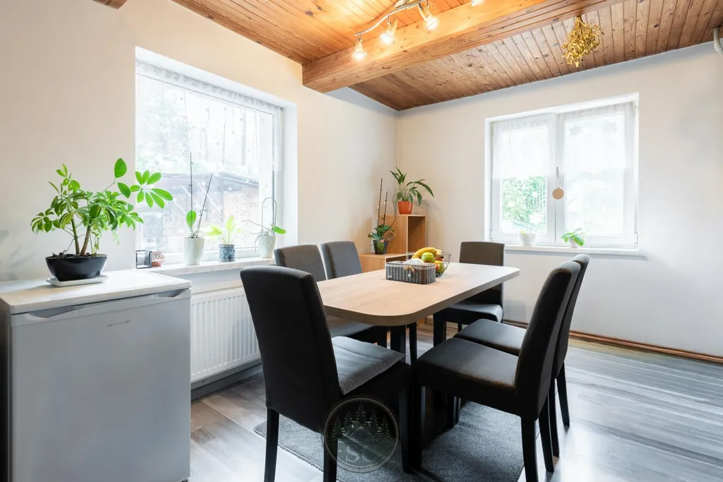 Dispozice domu je promyšlená a útulná. Vstupem se dostanete do předsíně, dále se zde nachází kuchyň s linkou a sporákem, obývací pokoj, ložnice, dvě menší místnosti (jedna slouží jako spíž), zrekonstruovaná koupelna se sprchovým koutem a WC. V kuchyni vynikají krásné stropní trámy, které prostoru dodávají příjemnou venkovskou atmosféru. V podkroví je ložnicová část rozdělená na dva dětské pokoje - i zde jsou dřevěné trámy, které interiéru dodávají osobitý charakter - a další samostatné WC. RD disponuje také půdními prostory.