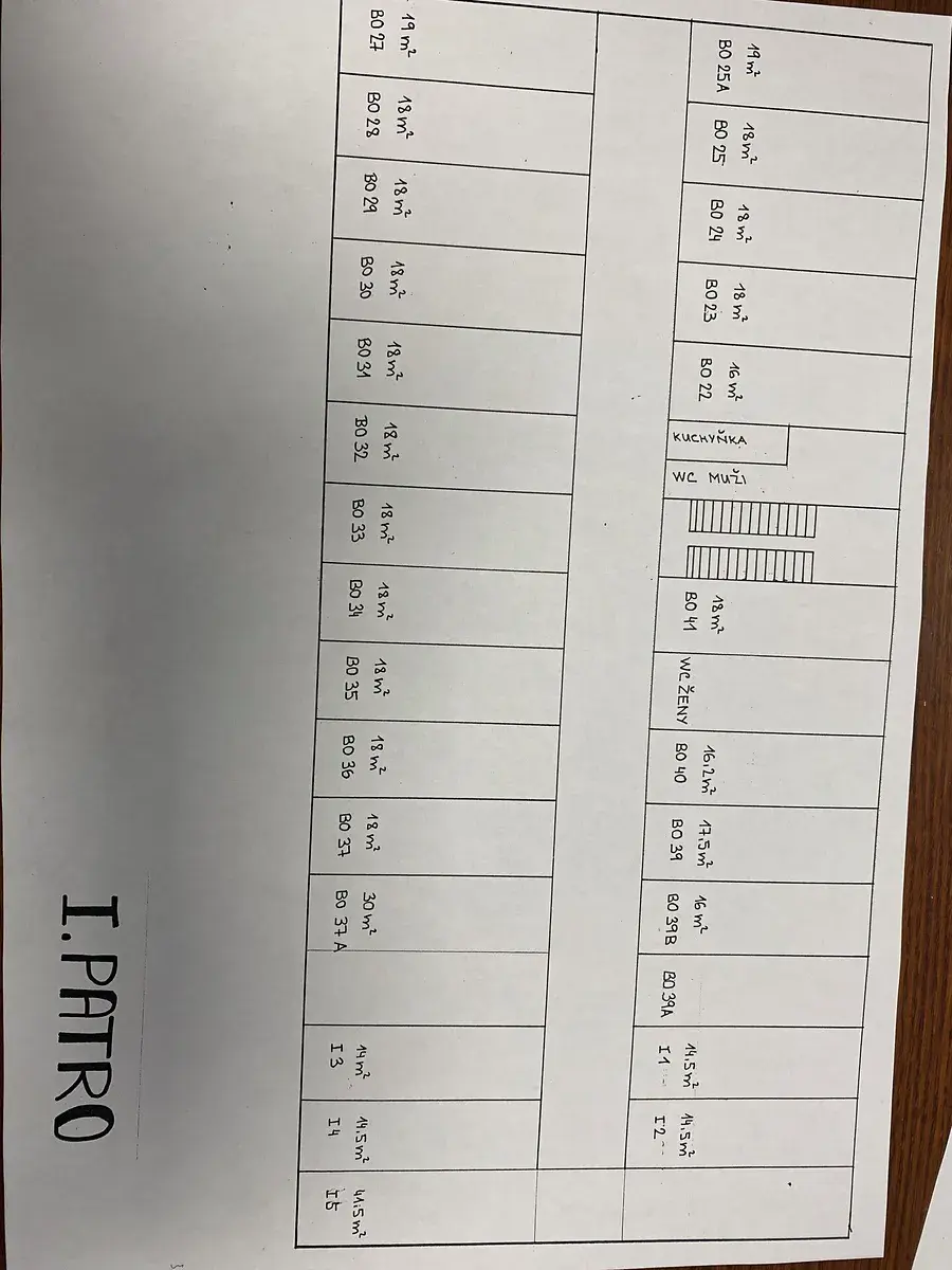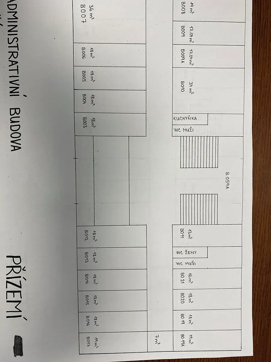 Přízemí - kancelář 17 m2 + 17 m2 + 18 m2 + 36 m2. Tyto kanceláře jsou v levé části přízemí objektu. Mají společnou chodbu, která je pod uzavřením.