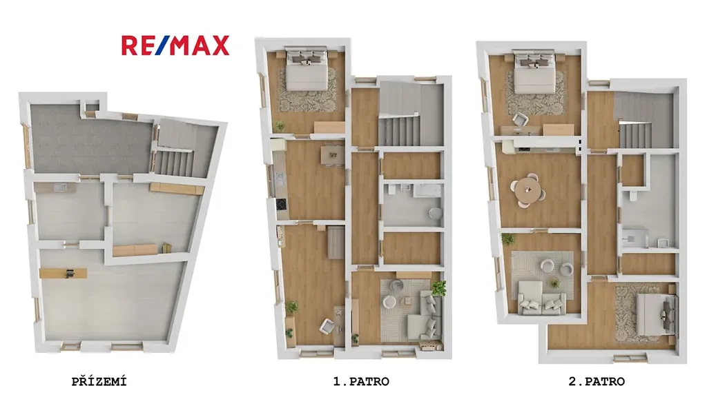 Druhé a třetí podlaží jsou koncipována jako samostatné bytové jednotky o dispozici 3+1 s užitnou plochou cca 112 m² a 102 m².